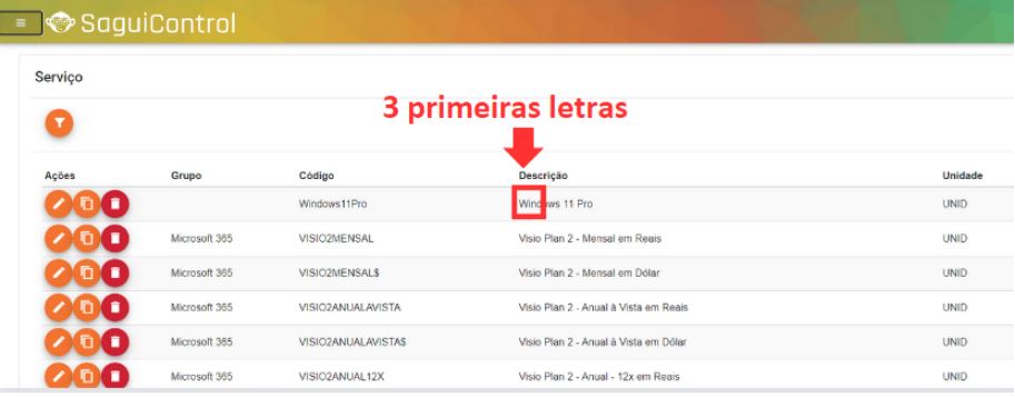 • Verifique se o serviço desejado consta nessa lista e quais as 3 primeiras letras que compõem a sua descrição: