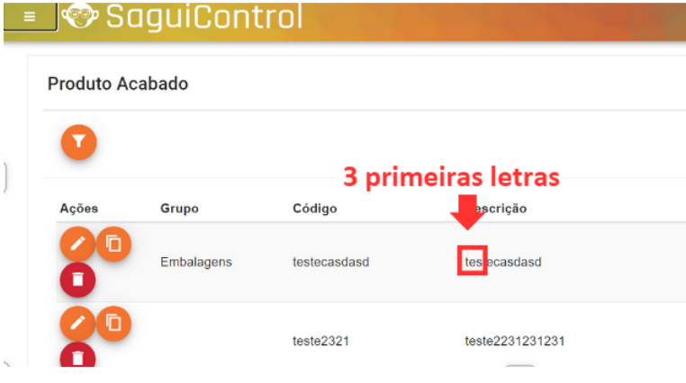 Verifique se o produto desejado consta nessa lista e quais as 3 primeiras letras que compõem a sua descrição.