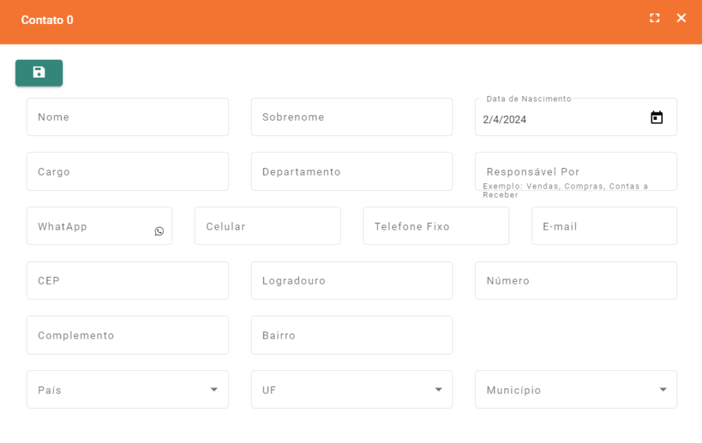 - Responsável por: A área ou responsabilidade do contato na empresa, como Vendas, Compras, Contas a Receber, etc;