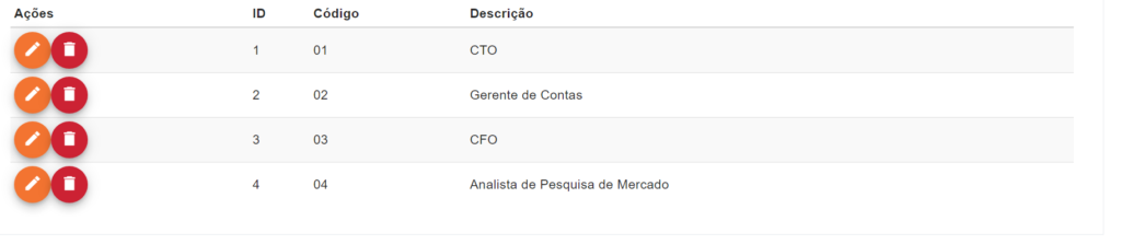 Todos os Cargos filtrados na seção anterior, serão listados nessa tabela de acordo com o filtro configurado. Então, por exemplo: Se você pedir pra trazer todos Cargos inativos, apenas Cargos que correspondem a essas características serão listados.