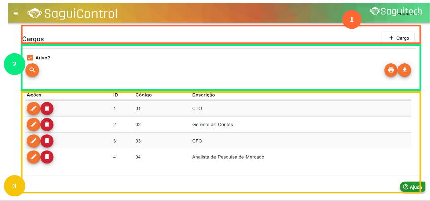 A tela de Gestão de Cargos será aberta. Essa tela é composta por 3 principais seções: