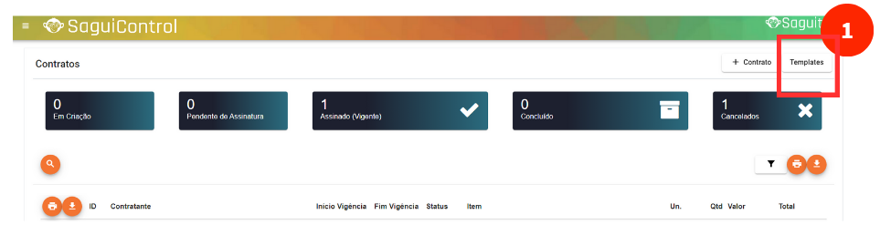 A partir daí você poderá encontrar o Template criado, ao acessar “Templates”, na funcionalidade Contratos.