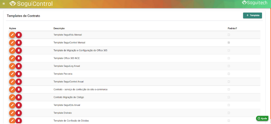 O Saguicontrol oferece a funcionalidade de gerenciar Templates de contratos, permitindo que sua empresa tenha vários modelos de contratos pré-configurados no sistema. Isso facilita a escolha do melhor modelo no momento da geração do contrato para seu cliente.