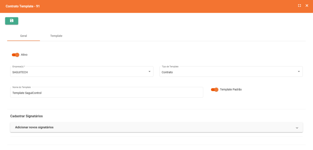 , para que sempre que um “Contrato” for gerado, esse Template venha automaticamente; e cadastrar os Signatários Padrão do Template, que serão automaticamente puxados quando o Template for utilizado.