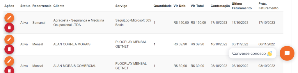 - Próximo faturamento: Data agendada para o próximo faturamento automático desse serviço.