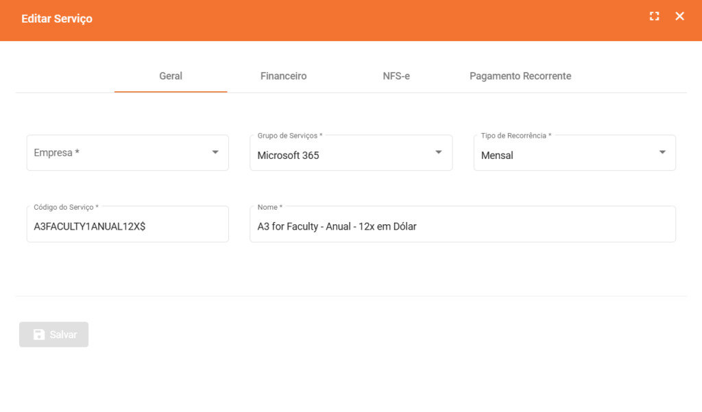 - Empresa: Selecione a qual empresa o Serviço ou Pacote de Serviço pertence;