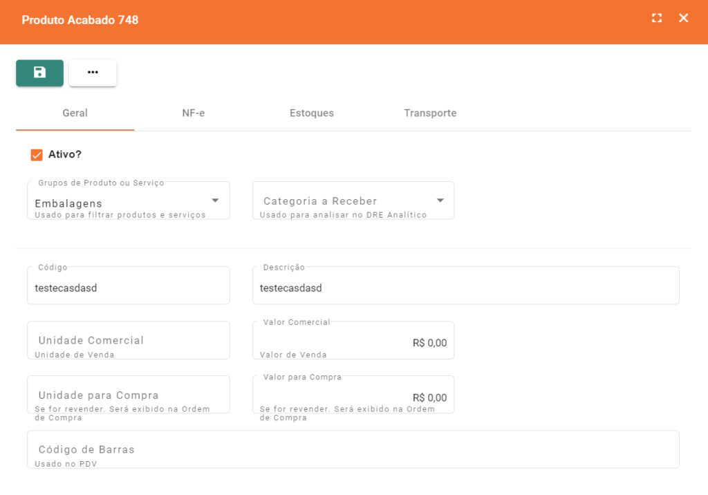 • Ativo?: Para indicar se o Produto está ativo ou não;