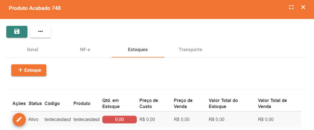 Nessa aba é possível visualizar, editar ou criar novos estoques para esse produto.