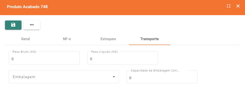 Nessa aba é possível adicionar as informações de transporte desse produto. Os seguintes campos serão carregados para preenchimento: