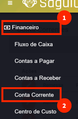 Para iniciar, acesse o menu à esquerda do Saguicontrol e selecione a opção “Financeiro” e em seguida clique em “Conta Corrente”. Você será direcionado para a tela de Gestão de Contas Correntes.