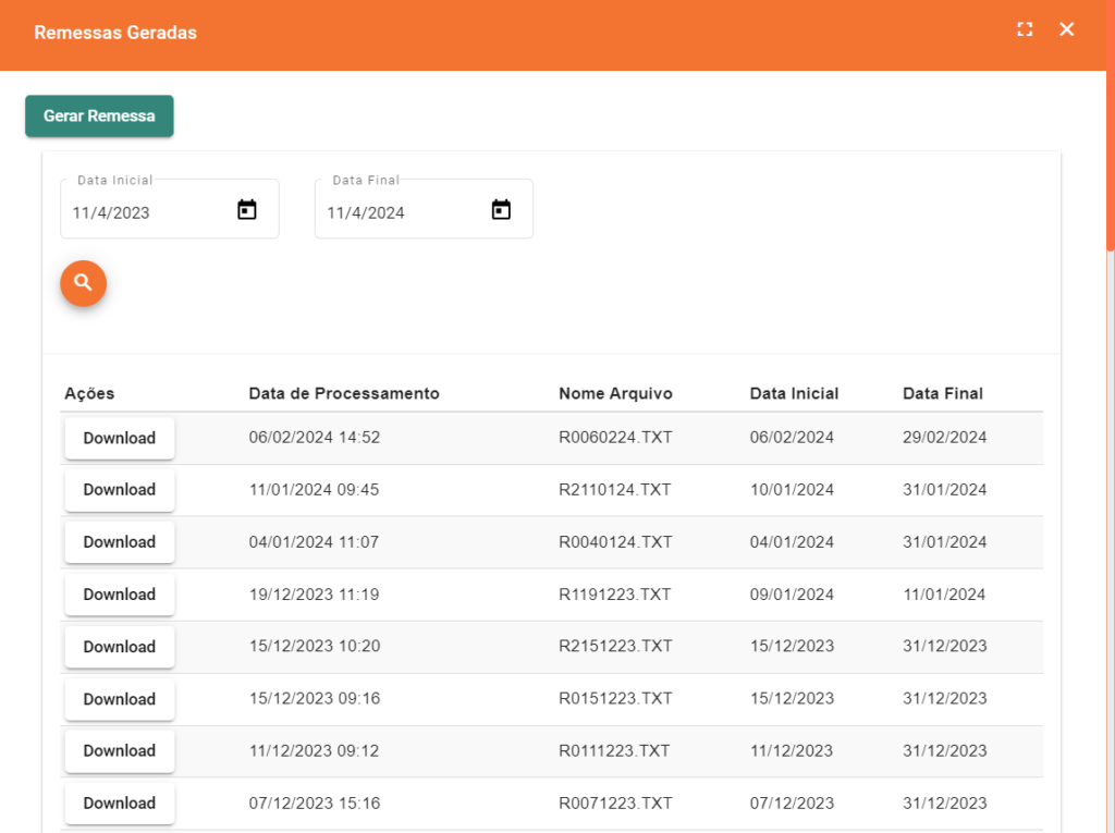 Por fim, clique em “Gerar Arquivo de Remessa”. O arquivo será baixado para o seu computador.