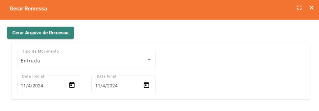 Clique no botão “Remessa” da Conta Corrente desejada. Uma janela será aberta, permitindo filtrar por data todas as remessas geradas anteriormente.