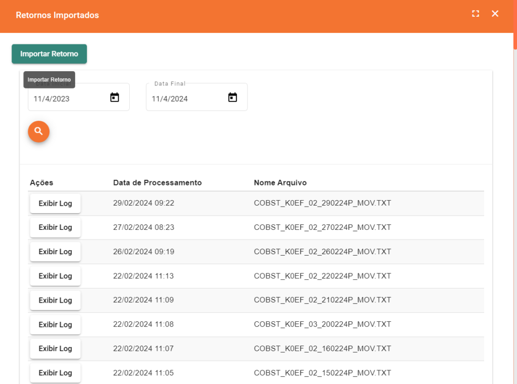 Assim como na geração de remessa, uma janela será aberta, permitindo filtrar por data todos os retornos recebidos.