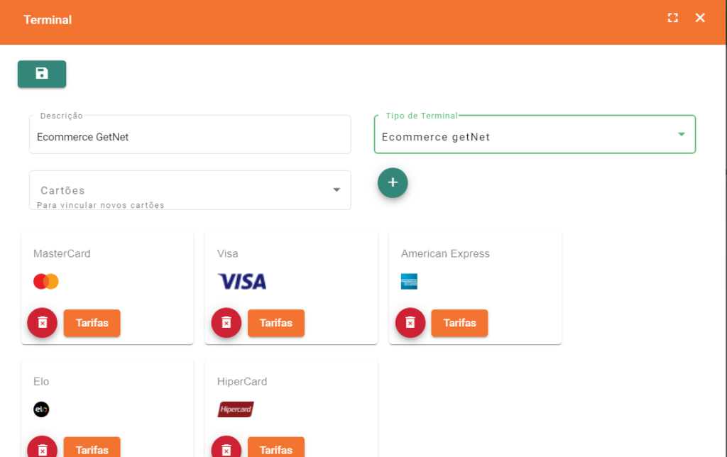 Além disso, é possível inserir as bandeiras de cartão que o seu terminal aceita e as tarifas para cada uma.