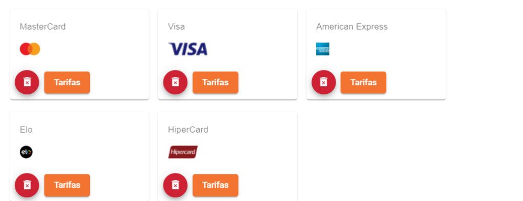 Para editar as tarifas de cada bandeira, clique no botão “Tarifas” localizado no cartão da bandeira desejada.