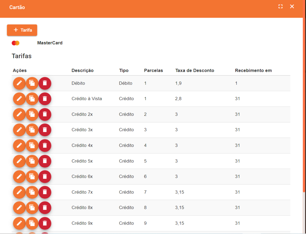 Nessa janela, é possível fazer a gestão de todas as tarifas: criar, editar ou excluir alguma tarifa desejada.