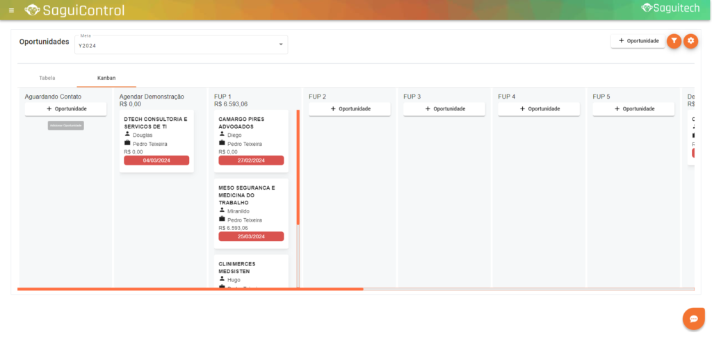 A Tela de Gestão de Oportunidades no SaguiControl oferece uma visão consolidada e ágil das oportunidades de negócio, facilitando o acompanhamento e a gestão do pipeline de vendas.