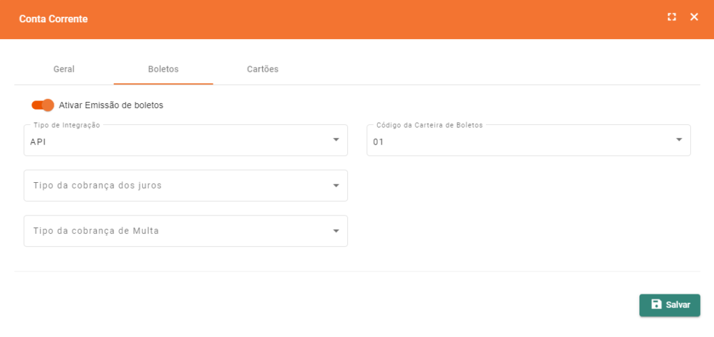 Acesse a tela de Criação/Edição de Contas Correntes, e selecione a aba “Boletos”.