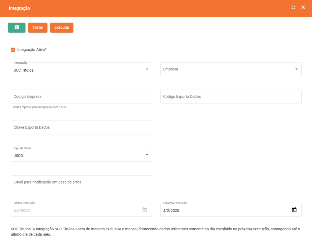 A integração SOC Títulos opera exclusivamente de forma mensal, fornecendo dados referentes ao dia escolhido na próxima execução, abrangendo até o último dia do mês anterior.