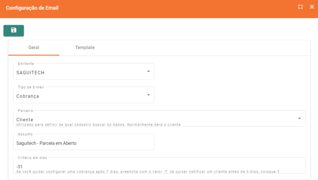 - Número Negativo: Se preferir enviar o e-mail após o vencimento da fatura, insira o número de dias após o vencimento aqui. Por exemplo, se deseja enviar o e-mail dois dias após o vencimento, insira “-2” neste campo.