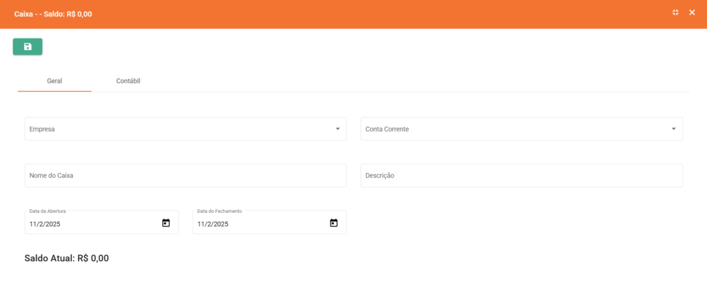 - Data de Abertura: Define a data de início das operações do Caixa;