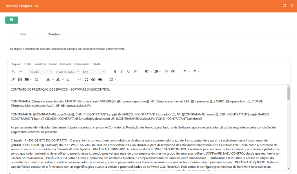 Por exemplo, você pode inserir uma tag para a Razão Social da sua empresa e outra para o nome do cliente. Durante a geração do contrato, essas tags serão substituídas pelos dados correspondentes, tornando o contrato personalizado para cada situação.