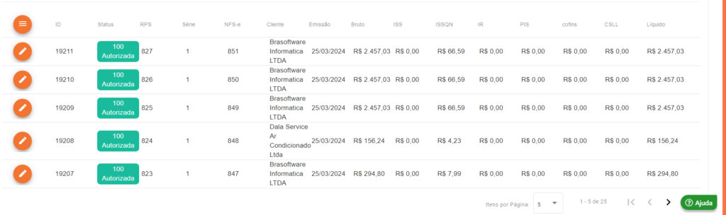 Ainda na tabela de visualização, cada Nota Fiscal listada possui um botão com o ícone de um lápis do seu lado esquerdo.